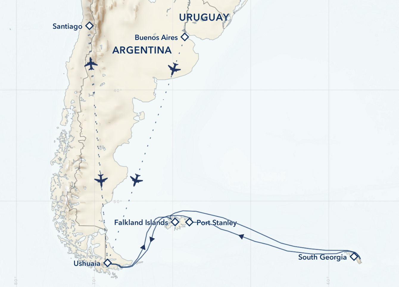 This relatively simple itinerary requires a flight from Chile to the Falkland Islands, or a cruise from Argentina. After arriving at the Falkland Islands, a 2-day cruise journey to South Georgia follows. This itinerary typically departs, around late October, at the start of season, or late February, with prices starting at US$10,395. In the coming season, an operator with ships fewer than 50 passengers will offer in-depth, single-island itineraries that only visit South Georgia.