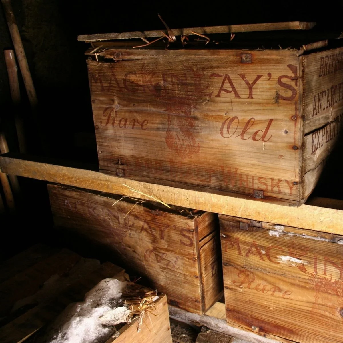 原来当年出发前,沙克尔顿爵士曾向麦肯雷威士忌公司(Mackinlay)订购25箱老高地麦芽威士忌,陪伴远征队前往南极。在返回英国之前,沙克尔顿爵士曾将用不到的物资留在罗德斯角的基地,希望后来的冒险家可以自由取用。这批物资包含了粮食、设备、以及炉子,数量之丰富,足够让15个人在这里待上一整年。当中也包含了这三箱威士忌。