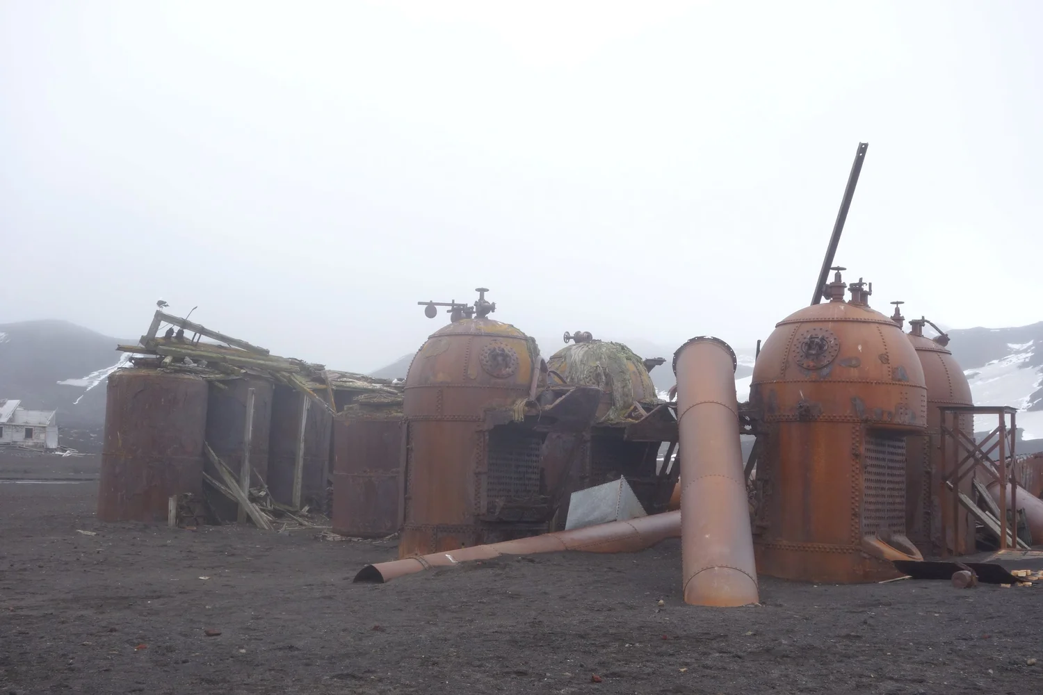 从空拍影片可以清楚看见当年鲸鱼加工厂遗留下的各种加工设备