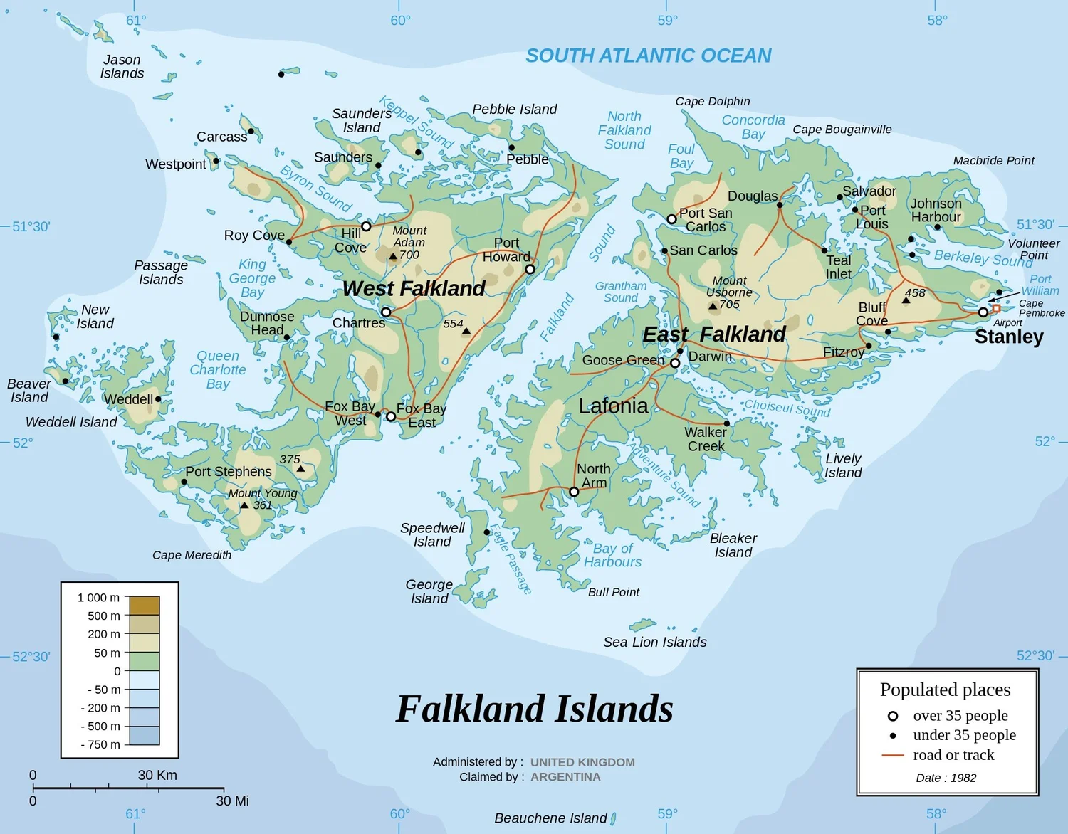 因为福克兰群岛战争,这片群岛有着两个名字:英国和其他国家称呼它为「福克兰群岛」,拉丁美洲各国和中国则以「马岛(马尔维纳斯群岛)」标记它。福克兰群岛实际上包含了将近800座大大小小的岛屿,其中最大的两个分别是首都史坦利(Standley)所在的东福克兰岛,以及西福克兰岛。它们之间被福克兰海峡(Falkland Sound)分隔,仅能仰赖船只或飞机才能来往。若是搭乘游轮造访,只要游轮公司有安排两天的停留时间,在天气允许的前提下,东西两座岛屿都会安排不同的地点登陆。